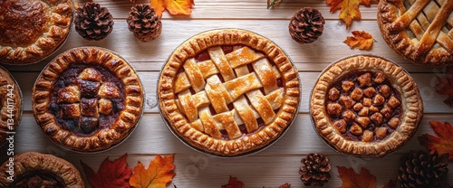 fall, autumn, pie, pumpkin, apple, pecan, homemade, lattice, fruit, wood, white, thanksgiving, holiday, baked, delicious, sweet, pastry, traditional, season, table, tradition, variety, rustic, dessert, fresh, overhead, top, down, view, background, border, frame, banner, nut, tart, space, empty, harvest, assortment, group, leaf, natural, light, cosy, composition, colours, palette