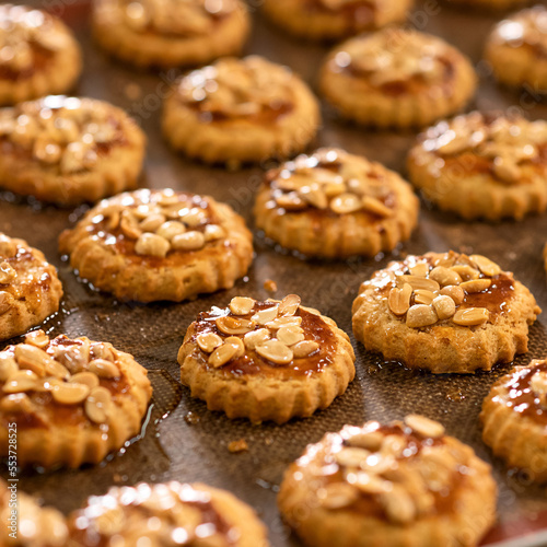 Homemade shortbread dough cookies with caramel and nuts. Festive dessert. Baking is laid out on paper. Close-up, soft focus.