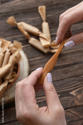 Homemade toffee candy in a female hand.