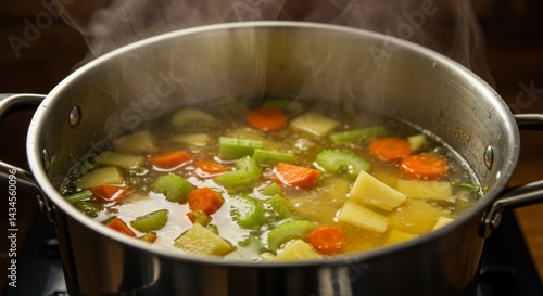 Homemade Vegetable Soup in Pot - A steaming pot of homemade vegetable soup, filled with carrots, potatoes, and celery. Perfect for a cozy meal