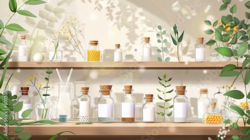 homeopathic, remedy, glasses, ampoule, jar, display, wooden, shelf, greenery, natural, medicine, alternative, therapy, holistic, health, wellness, elegant, serene, apothecary, botanical, organic, healing, plant, herbal, environmentally friendly, peaceful, clean, aesthetic, medicative, treatment, homeopathy, supplement, pharmaceutical, product, health care, presentation, simplicity, modern, lifestyle