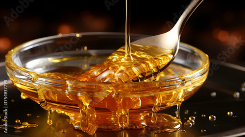 Honey drizzling from spoon into a glass bowl on a dark surface highlighting its golden color and texture