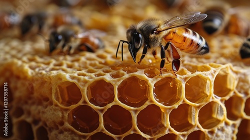 honeycomb, bee, bee, honey, hexagon, cell, gold, sweet, nature, insect, closeup, macro, pollen, nectar, wing, leg, abdomen, chested, head, antennae, compound, eye, men at work, colony, hive, apiary, beeswax, agriculture, farming, food