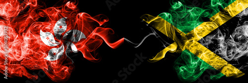 Hong Kong, China vs Jamaica, Jamaican smoky mystic states flags placed side by side. Concept and idea thick colored silky abstract smoke flags