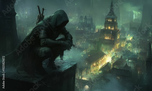 night, city, city landscape, urban, building, architecture, shadow, hooded, figure, person, dark, mysterious, fantasy, mediaeval, gothic, silhouette, fog, mist, rooftop, lookout, observation, hidden, stealth, concealed, danger, adventure, art, illustration, painting