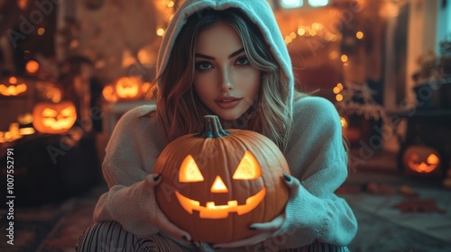 Hooded Girl with Illuminated Pumpkin Lantern in a Dark Halloween Setting