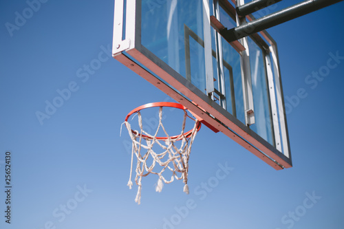 basketball, hoop, net, sport, basket, sky, game, blue, ball, backboard, court, play, equipment, goal, competition, sport, board, white, tower, team, fun, rim, score, activity