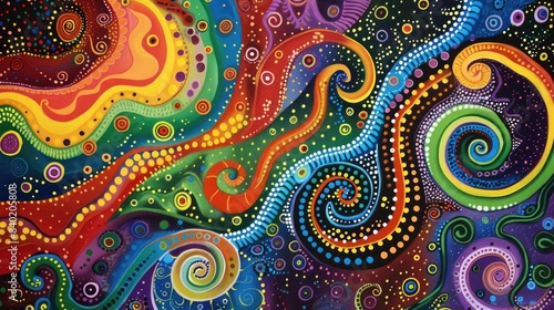 Horisontal abstract illustration of psychedelic colorful swirls and dots, vibrant colors. High quality photo