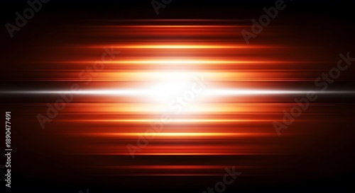 Horizontal light bars with a central flare. Digital data streaming and network speed. Bright orange glow pulses through a dark cyber space representing high bandwidth