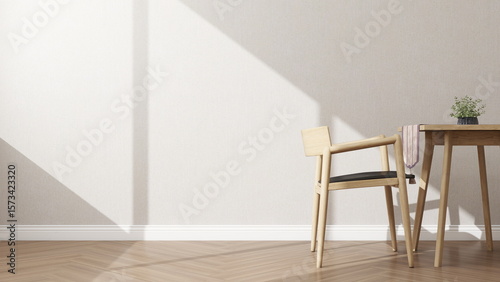 Horizontal mockup of a white wall with a dining set. 3D rendering, interior design, 3D illustration