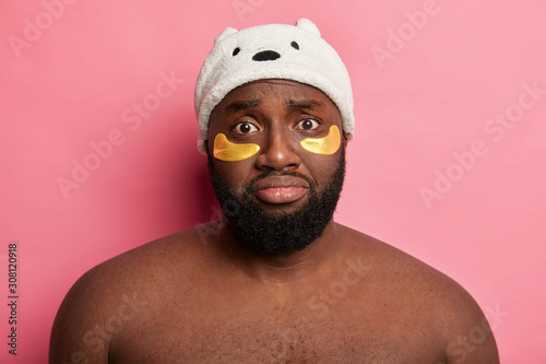 shoulder, head shot, closeup, displeased, studio, wrinkle, person, naked, rose colored, photo, posing, bare, pink, well-being, man, clean, relax, healthy, care, puffiness, feeling, shot, male, face, cosmetic, cosmetology, upset, gloomy, emotional, sad, hygiene, beard, indoor, therapy, wellness, fats, human, spa, standing, black, discontent, mask, patch, skin, unshaved, gold, collagen, treatment, stubble field, dejected