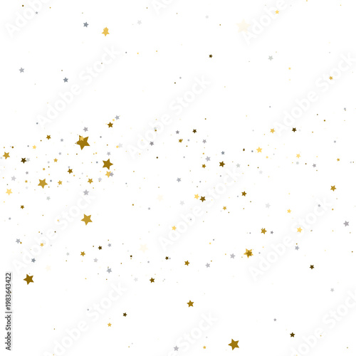 Horizontal wave of gold and silver stars on white background. Festive sparkling confetti. Copy space for text