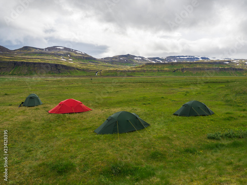 Hornvik campsite with three green tents and one red and view on beautiful Hornbjarg cliffs in remote nature reserve with green meadow, waterfall and hills, moody sky, Iceland, west fjords Hornstrandir