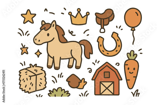 horse, doodle, icon, icon, set, hand, drawn, saddle, horseshoe, crown, star, balloon, hay, barn, smiling, carrot, composition, with, many, small, detail, cute, friendly, style, limited, colours, palette