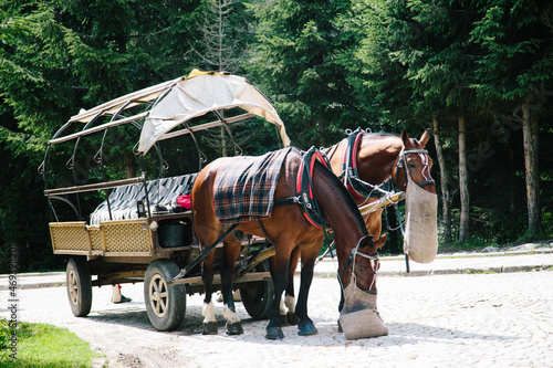 Horse eats a forage in forest, Horses carriage in mountains Poland Zakopane, Resting eating horses. Feeding of horses somwherein mountains