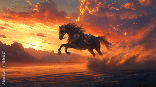 Horse galloping at sunset desert landscape artwork dramatic sky energetic vibe