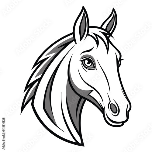horse, head, animal, equine, illustration, drawing, black-and-white, graphic, design, art, vector, logotype, mascot, silhouette, profile, stylised, cartoon, line art, simple, elegant, powerful, strong, mammal, domestic, farm, breed, racing, riding, stable, beauty, noble, wild, spirit, speed, power, energy, freedom, nature, outdoors, icon, symbol, poster, print, image, template, colouring