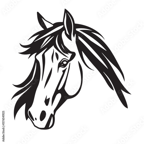 horse, horsehead, equine, pony, mustang, fast horse, wild horse, racehorse, gallop, animal, pet, creature, farm animal, ranch, western, minimalist, line art, black-and-white, monochrome, silhouette, drawing, vignetting, contour, classic, traditional, emblem, symbol, logo design, branding, identity, vintage, isolated