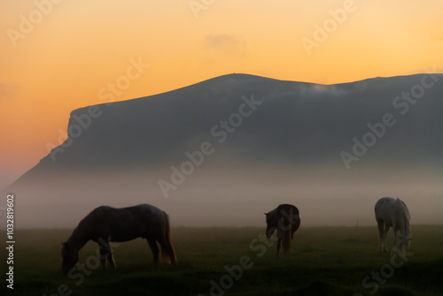 sunset, horse, silhouette, animal, nature, landscape, sun, wild, vector, sunrise, animal, sky, illustration, grass, farm, field, meadow, wildlife, orange, summer, fog, iceland, dusk