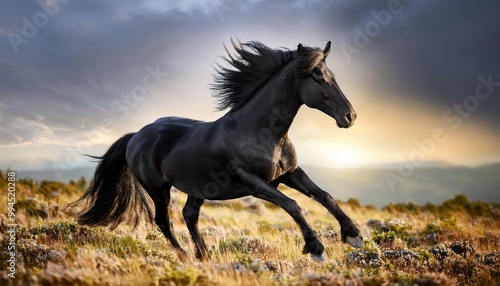 horse runs. Black horse play on the meadow