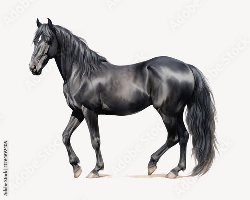 domestic animals, equestrianism, full-length, herbivorous, pack animal, studio shot, copy space, one animal, watercolor, farm animal, half face, isolated, lighting, fast horse, standing, cut-out, animal, mammal, nature, studio, black, horse, light, photo, white, clip, foal, mane, mare, real, shot, side, view, art