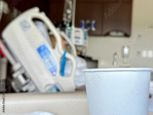 Hospital room with a coffee cup in focus and medical equipment in the background during a calm morning