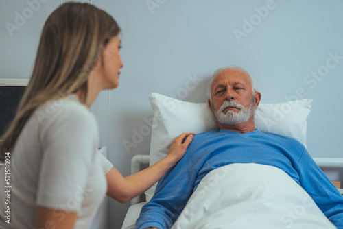 Hospital visit from the family daughter for sick senior. In the Hospital Ward Recovering Father is Visited by Daughter. Senior Sick Man Sleeping in Bed Daughter Sits Beside, Worrying.