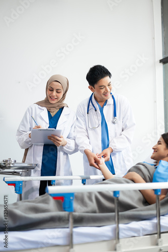 Hospital Ward Male and Male Professional Asian Doctors Talk with a Patient, Give Health Care Advice, Recommend Treatment Plan