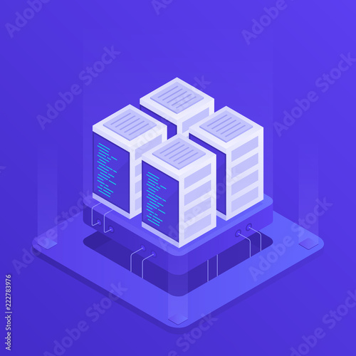 Hosting concept with cloud data storage and server room. Server rack. Modern Vector illustration in Isometric style