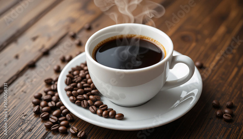Hot Black Coffee in White Cup with Coffee Beans on Wooden Table
