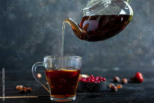 hot, space, aroma, aromatic, drink, green, healthy, herb, pot, spoon, tea, teacup, teapot, slice, berry, cranberry, caramel, sugar, walnut, apple, hazelnut, wooden, black, red, herbal, rosehip, anise, dark, glasses, warming, winter, steam, hand, part, pour, flow