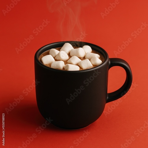 Hot chocolate drink with melting marshmallows in black mug on red background. Warm beverage for winter season. Cozy comfort food for holiday.