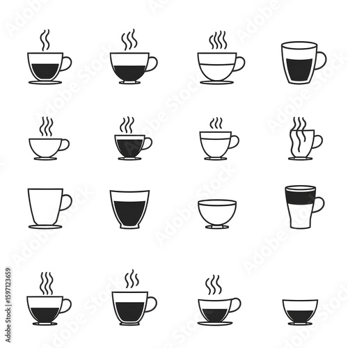 hot drink, cup, cafes, drink, hot beverage, espresso, latte, mug, steam, caffeine, barista, minimal, breakfast, hot drink, cappuccino, tea, vector, icon, set, hot, illustration, design, food, symbol, beverage, signs, glasses, mocha, vintage, eatery