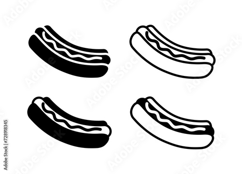 Hot dog icons set, sausage in a bun. Fast food or cafe symbol. Menu or lunch attribute.