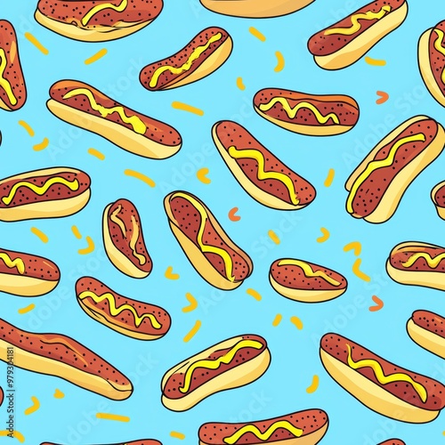 hot dog, mustard, bun, sausage, pattern, seamless, background, blue, yellow, food, fast food, snack, delicious, tasty, doodle, cartoon, vector, illustration, graphic, design, print, textile, fabric, wallpaper, wrapping paper, digital, art, cute, funny, playful, summer, picnic, bar-b-q, party