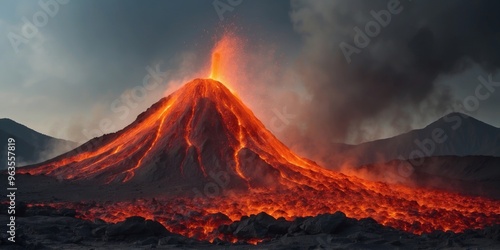 Hot lava is erupting from the volcano with smoke Natural disaster.