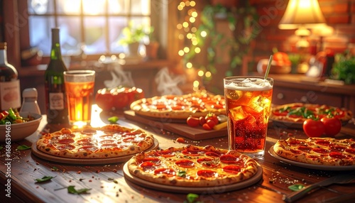 Hot pepperoni pizza with melted cheese and basil, served with fries and cold beer on a wooden table in a cozy pub setting.