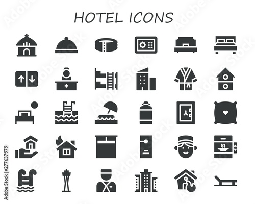 hotel, icon, set, vector, hut, dinner, pool, single, bed, double, elevator, reception, bunk, building, bathrobe, house, swimming, island, canteen, pillow, door, hanger, concierge, space, needle, bellboy, beach, illustration, signs, symbol, design, isolated, line, silhouette, flat, black, element, graphic
