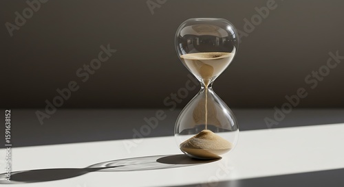 hourglass, time, sand, clock, timer, deadline, countdown, passing time, temporal, glasses, transparent, vintage, antique, measurement, urgency, business, schedule, waiting, patience, control, pressure, opportunity, planning, management, slow, flow, grain, period, duration, shadow, light, still life, minimalist, simple, neutral, beige
