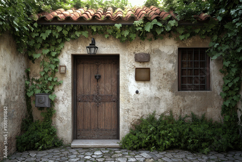 House. A rustic door surrounded by ivy and stone, exuding charm and character, invites curiosity and hints at stories within.