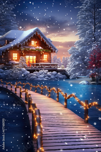 House by the lake, beautiful winter atmosphere, Christmas holidays