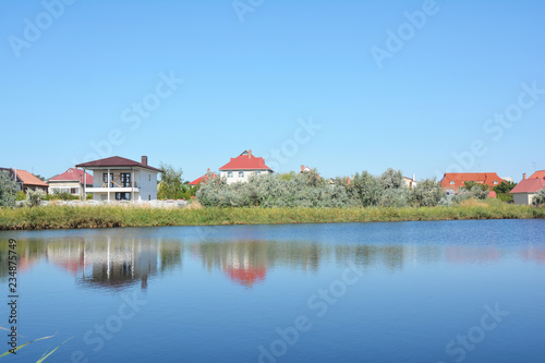 House construction with many houses and cottages on the lake bank with beautiful view.