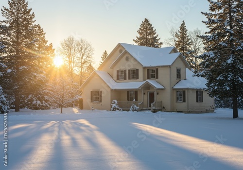 house, snow, winter, tree, sun, day, cold, season, home, exterior, architecture, building, residential, landscape, frost, white, rural, scene, nature, country, farm, yard, property, estate, suburb, snowy, weather, morning, light