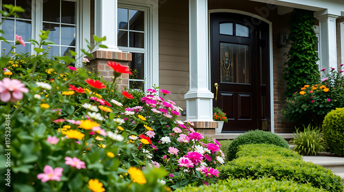 House Entrance with Flowerbed and Landscaping
