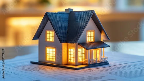house financial investment Concept. Lit miniature house model on a table with warm ambiance.