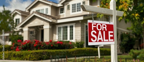House for sale. A stunning real estate photograph of a suburban home with a "for-sale" sign in the yard, indicating that the property has already been sold