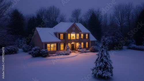 House illuminated by a soft winter glow with snow, creating a cozy and cold exterior atmosphere