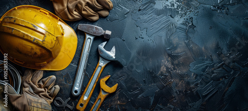 House improvement, construction and renovation concept. Repair tools and helmet in flat lay