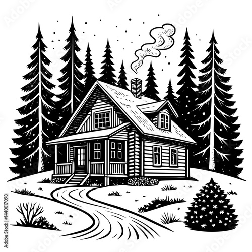 winter, christmas, snow, tree, house, landscape, christmas, forest, holiday, village, season, illustration, scene, vector, cold, nature, celebration, home, tree, pine, fir, card, wood, sky, decoration