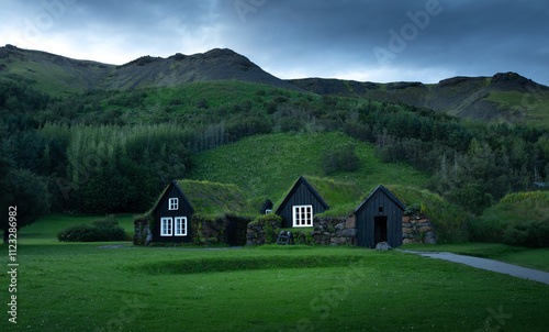 house, mountain, landscape, heaven, nature, grass, green, farm, summer, field, meadow, rural, building, countryside, alpes, cloud, norge, blue, tree, cabin, view, wood, bungalow